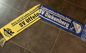 Vor einigen Wochen ist beim SV.Dickenberg das vor einigen Jahren eröffnete Vereinsheim abgebrannt und wird nun mit viel Herzblut wieder aufgebaut. Als langjähriger Nachbarverein möchten wir den SV. Dickenberg unterstützen, nur wie? Und nun kommt ihr, liebe Sportlerfamilie des SVU ins Spiel. Wir haben als Zeichen der engen Verbundenheit einen neuen Fan-Schal entworfen und bieten diesen zum Preis von 20,-€ zum Kauf an. Pro verkauften Schal geht die Hälfte des Kaufpreises, also 10,- €, an den SV. Dickenberg.