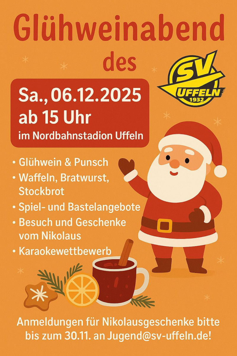 Die Verantwortlichen beim SVU haben für Samstag, 06. Dezember alles vorbereitet. Es soll nicht beim Glühwein bleiben, für das leibliche Wohl mit Waffeln, Grillwurst und Stockbrot ist gesorgt. Damit der Nikolaus die Kids auch mit kleinen Geschenken verwöhnen kann, müssen diese allerdings bis Sonntag, 30.November unter email  Diese E-Mail-Adresse ist vor Spambots geschützt! Zur Anzeige muss JavaScript eingeschaltet sein! angemeldet werden.